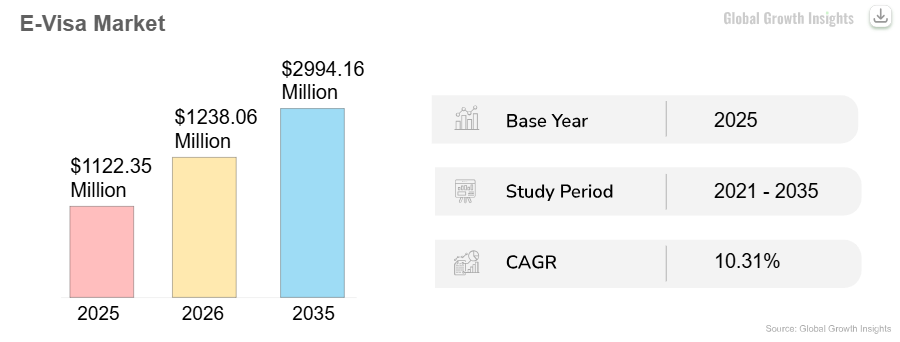 As reported by Global Growth Insights, the global e-visa market continues to demonstrate strong and sustained growth. Valued at USD 1,122.35 million in 2025, the market is projected to increase to USD 1,238.06 million in 2026, and further expand to approximately USD 1,365.7 million by 2027 and USD 2994,16 million by 2035.