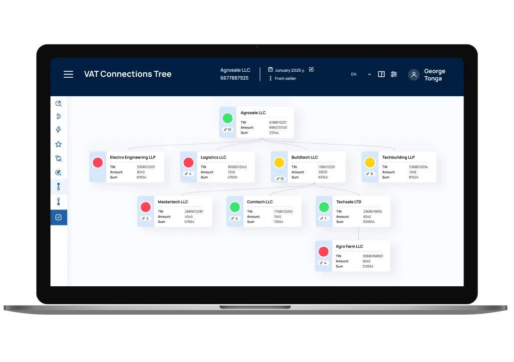 Violations are recorded, taxpayers are flagged, and transaction chains are analyzed through the VAT Connection Tree to detect proxy entities, beneficiaries, and fraud schemes.